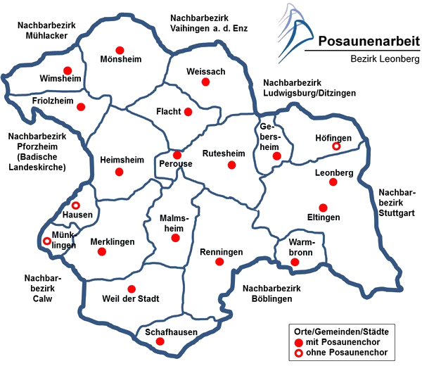 Übersicht der Posaunenchöre im Kirchenbezirk Leonberg. Klick auf den roten Punkt führt zur Webseite des jeweiligen Chors.